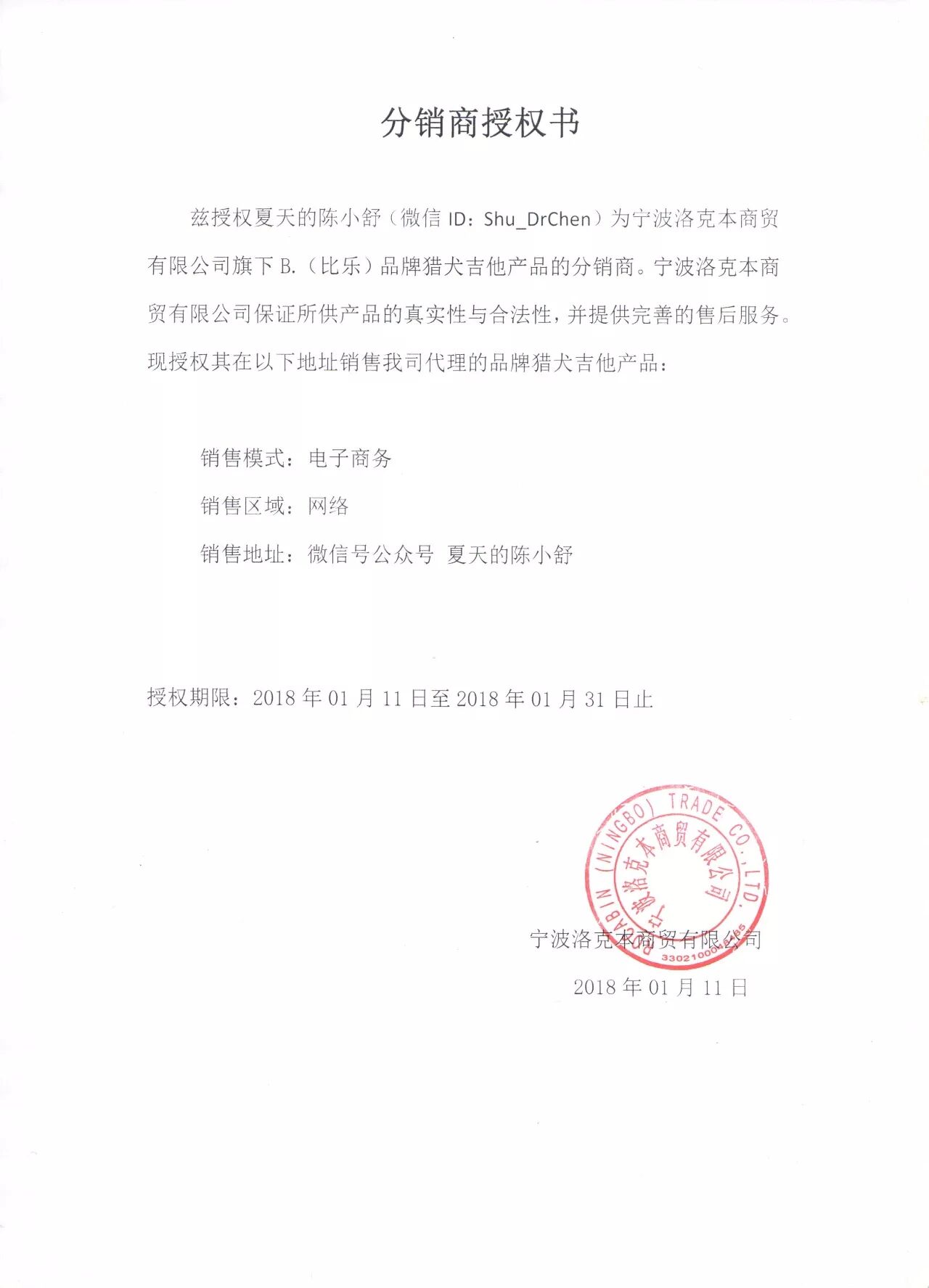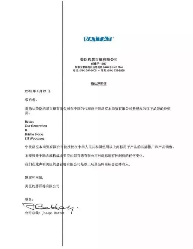 这是B.Toys给中国总代宁波洛克本公司的授权书