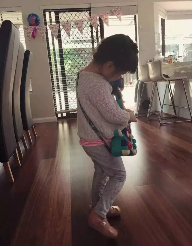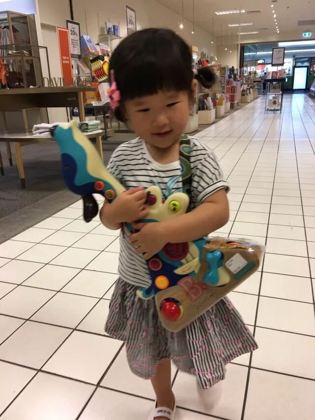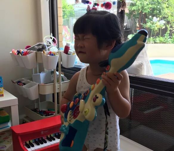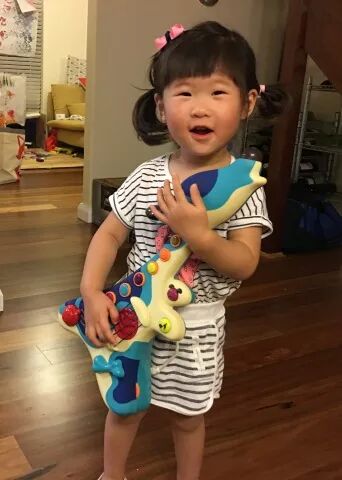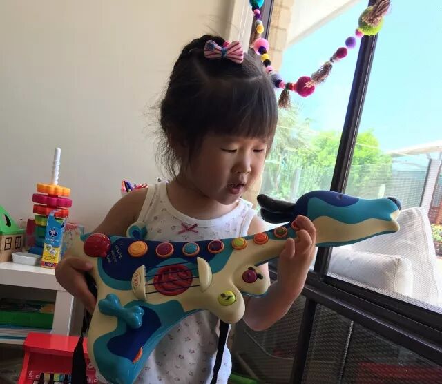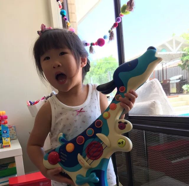 所以,我们在家,经常点开音乐CD,一起唱歌、跳舞。而每一次,每一次当妞妞背上她的小狗吉他,她都会跟着音乐转圈、跳舞。她会还会学着澳洲超火的儿童音乐节目里的吉他手那样表演。当她背着猎犬小吉他,跟随音乐节奏摆动身体,挥舞双手,拨动琴铉时,自我表现力和自信心瞬间爆棚!她会说,妈妈快来!跳舞~!这份快乐,也是在我记忆中闪耀的珍珠。