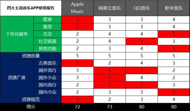 大体而言,资源质量上,国内三大APP与Apple Music模式不同。Apple Music一般而言资源来自官方,有一定保证,但不提供无损。在这一环节,四大APP差距不明显。Apple Music的国外音乐资源相当丰富,但并不全面。某种意义上甚至不如擅长收集各类资源的国内APP。但基本上能够满足听众需求。短板主要是国内小众艺人这一块,类似陈粒、李志等人的资源相当不全,部分在其他国内APP上资源相对全面的歌手,例如Miley Cyrus、The White Stripes等,在Apple Music上反而资源有限。但阻止一大部分人使用Apple Music的短板是,它对日本乐迷来说体验太逆天——资源少不说,还都是罗马音,看到歌名都想暴走。得益于辛勤的曲库君,网易云的国外小众艺人曲库基本只要你愿意去催,就会逐渐齐全。例如Jeffrey Lewis的Manhattan就是我苦口婆心催出来的。但网易云最大的问题在古典音乐方面,完整度相当捉急。国内方面,网易云与QQ共享索尼与华纳的独家版权,与拿到滚石独家的虾米分庭抗礼。QQ音乐的曲库齐全度和网易云基本类似,毕竟版权共享。但古典音乐方面比网易云要齐全,但小众国外艺人由于也不大是QQ音乐用户的菜,所以这方面的曲库也有待完善。QQ音乐厉害的一点在于,他们乐于购买各种音乐综艺的独家,我是歌手、中国之星、中国好歌曲等节目的首发音频带来了大量的流量。虾米音乐现在的曲库基本上是风雨飘摇,曲库缩到了原本的50%左右。但拿到了滚石独家的虾米有五月天之类的独家加持,吸引了很多迷妹。虾米的另一长处在于他握有寻光计划音乐人和虾米音乐,意思就是基本上国内牛逼的小众音乐人全都是虾米独家,因而得以稳扎稳打地圈住一批死忠用户。古典音乐:Apple Music>QQ>虾米>网易国外流行:网易=QQ>Apple Music>虾米