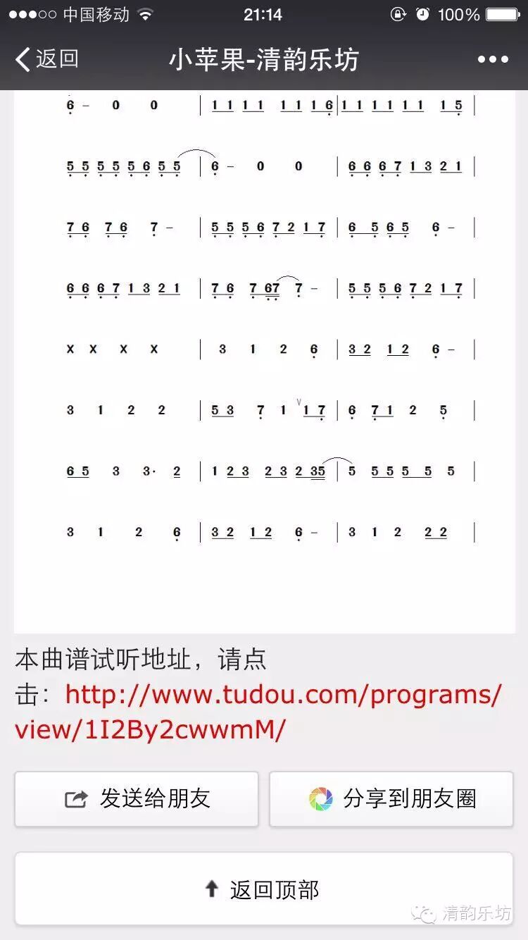 3.点开后你会发现以下界面,然后就可以根据自己的需要来选择曲谱了,比如,点击“小苹果”,弹出界面后,拉到最底端,可见试听链接网址,直接戳网址就可以听啦!