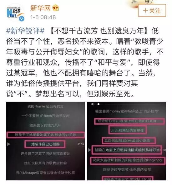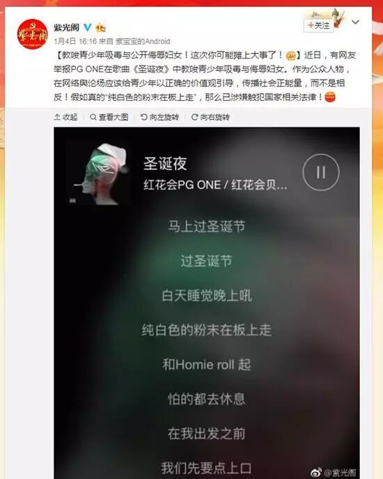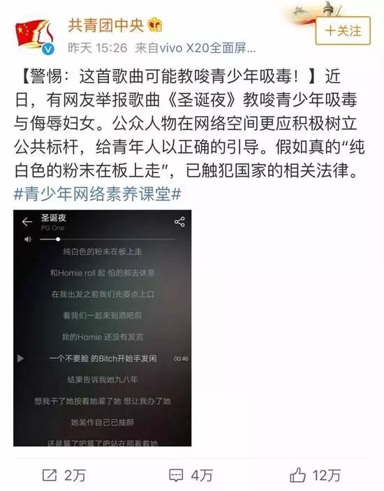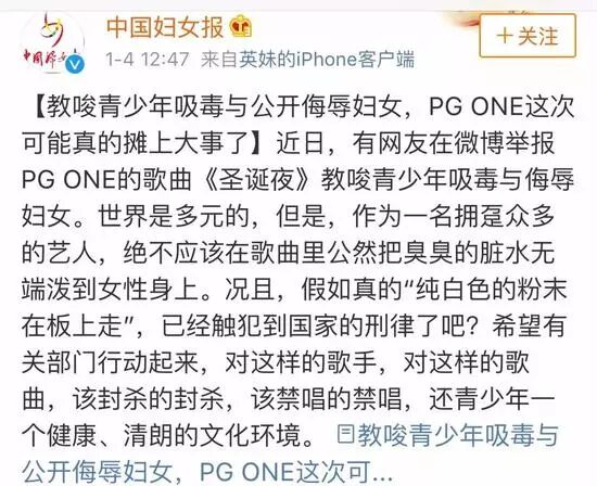 先是中国妇女报,直指歌曲《圣诞夜》中多处歌词公开教唆青少年吸毒与侮辱妇女,言语卑鄙无耻下流。