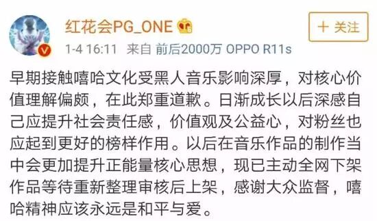 随之,网络上也爆出很多地下嘻哈斗RAP的互相DISS的视频,包括PGONE一些其他作品。我们不难从他的道歉声明中看到,说是受黑人音乐影响,对核心价值观理解偏颇。这种说话,仿佛舶来品嘻哈音乐的全部,就是地下黑人音乐中,充斥着全部都是自夸、脏词、暴力,毒品,性等等。