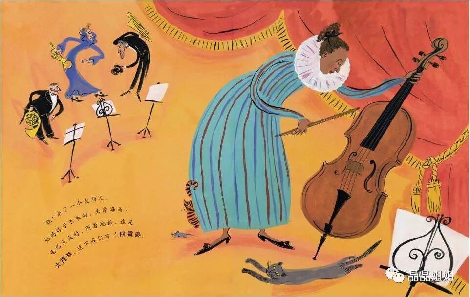 瞧!来了一个大朋友。他的脖子长长的,头像海马;尾巴尖尖的,顶着地板,这是大提琴。这下我们有了四重奏。