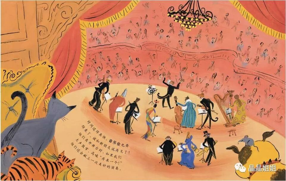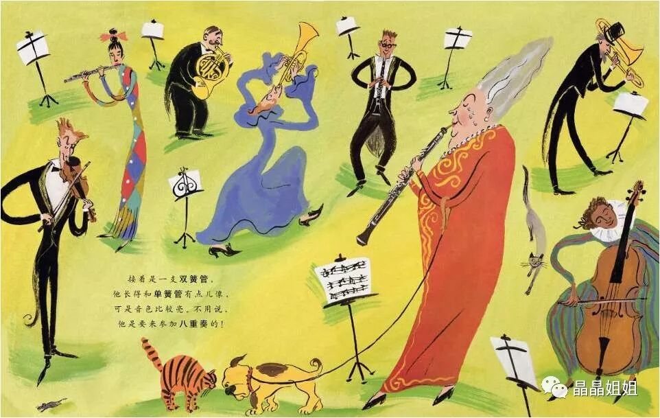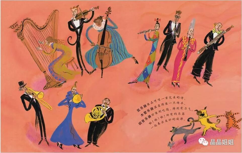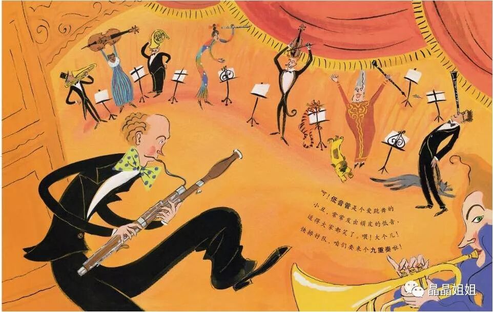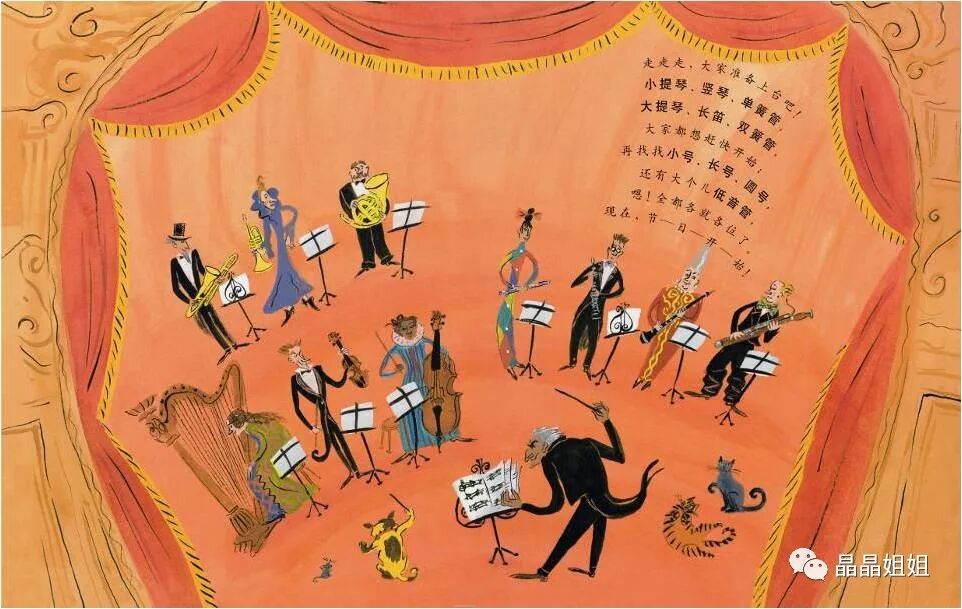 走走走,大家准备上台吧!小提琴、竖琴、单簧管、大提琴、长笛、双簧管,大家都想赶快开始;再找找小号、长号、圆号,还有大个儿低音管。嗯!全都各就各位了。现在,节——日——开——始!