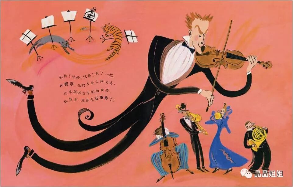 叽铃!叽铃!叽铃!来了一把小提琴。他的声音又细又高,好像飘在空中的细丝带。数数看,现在是五重奏了!