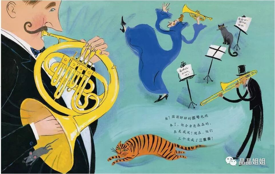 看!圆圆胖胖的圆号也跑来了。他全身亮晶晶的,真是威风!现在,他们三个变成了三重奏!