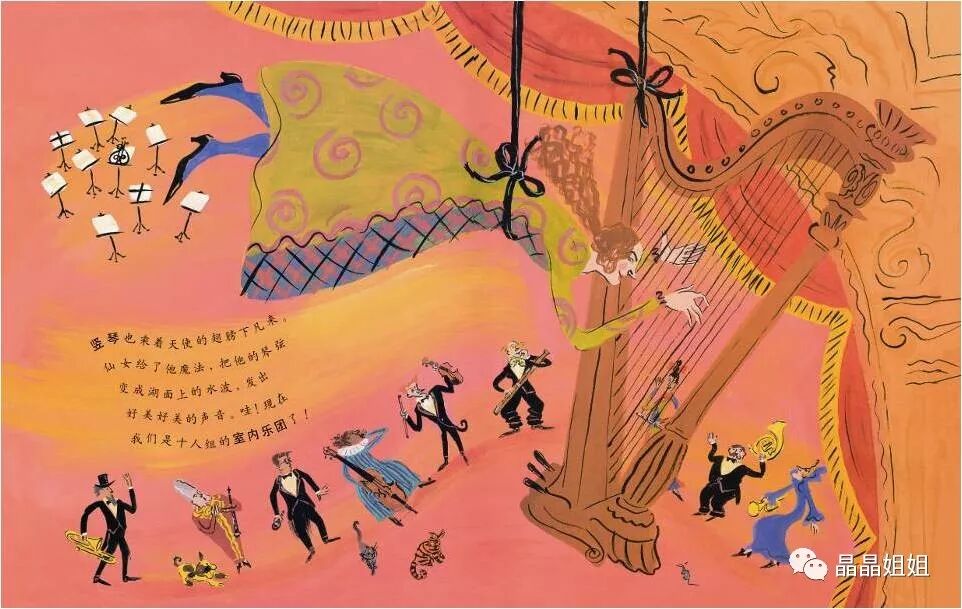 竖琴也乘着天使的翅膀下凡来。仙女给了他魔法,把他的琴弦变成湖面上的水波,发出好美好美的声音。哇!现在我们是十人组的室内乐团了!