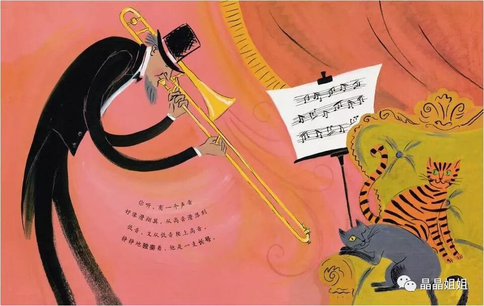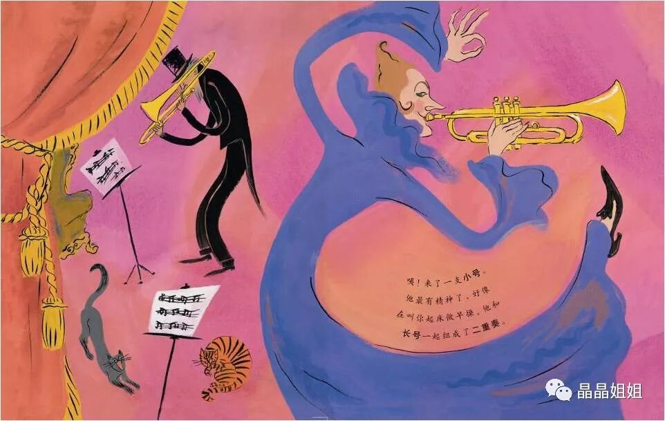 咦!来了一支小号。他最有精神了,好像在叫你起床做早操。他和长号一起组成了二重奏。