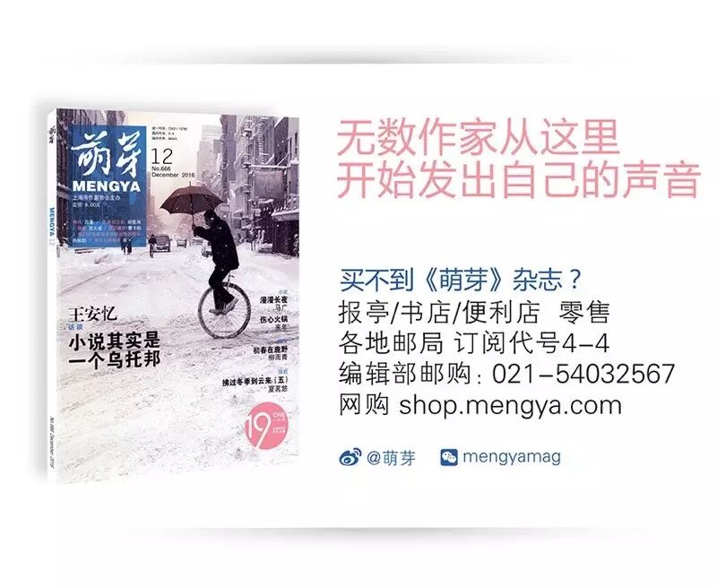 本文发表于《萌芽》2011年六月号。萌芽微信公众号所刊载内容之知识产权为萌芽杂志及相关权利人专属所有或者持有,未经许可,禁止进行转载、摘编、复制及建立镜像等任何使用。