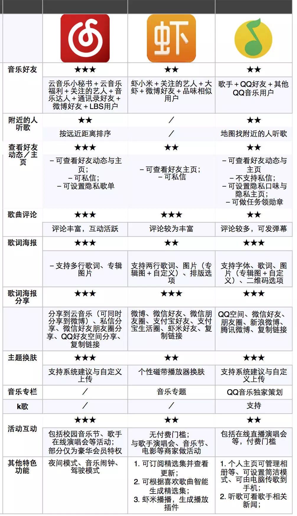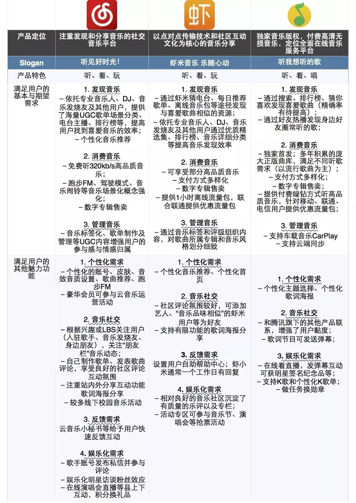云音乐在满足用户个性化、社交、反馈与娱乐需求整体领先于虾米音乐和QQ音乐,三款产品各有独特定位。云音乐和虾米音乐突出“听、看、玩”;QQ音乐突出“听、看、唱”。