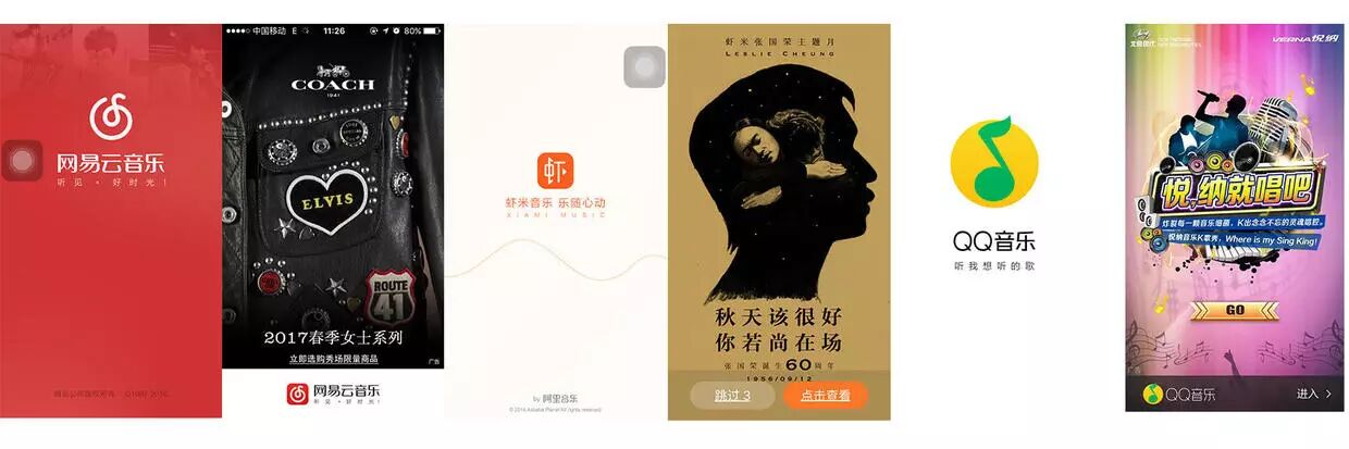 网易云音乐以鲜明的红色品牌标志性为主页,顶部的模糊人物较为独特;QQ音乐以鲜明的黄绿logo和大片白色为主主页;两者都在短暂的广告页随其后即进入主界面。