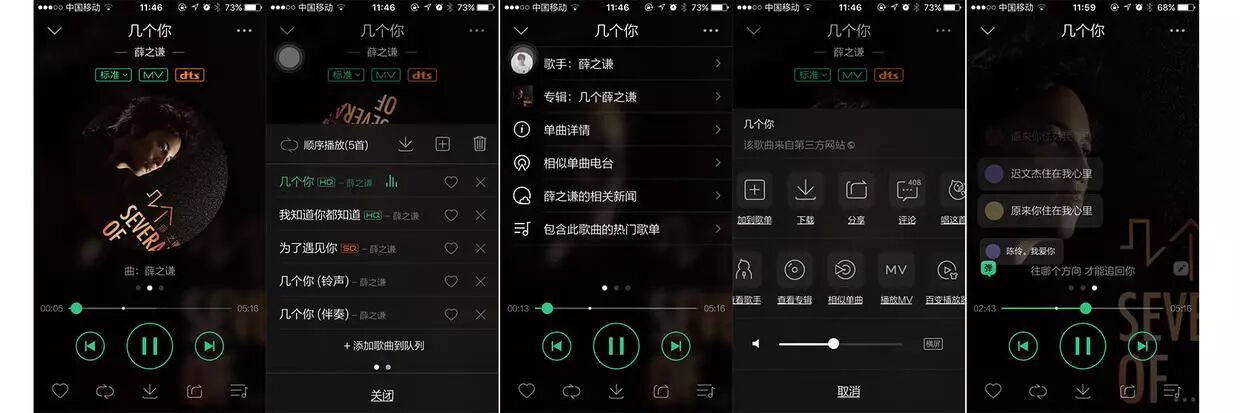 QQ音乐的播放界面以炫亮黑色星空感为主调,似乎也是唱片设计,突出了看“MV”、音乐品质选择、下载及分享功能。与虾米相似,QQ音乐提供了另两个页面切换,分别可了解歌手、专辑、所在歌单、相似单曲推荐、歌手新闻等信息以及查看歌词并在歌词页发弹幕互动。此设计的核心推广点并不突出,似乎在贪全但又不能充分满足用户的需求。