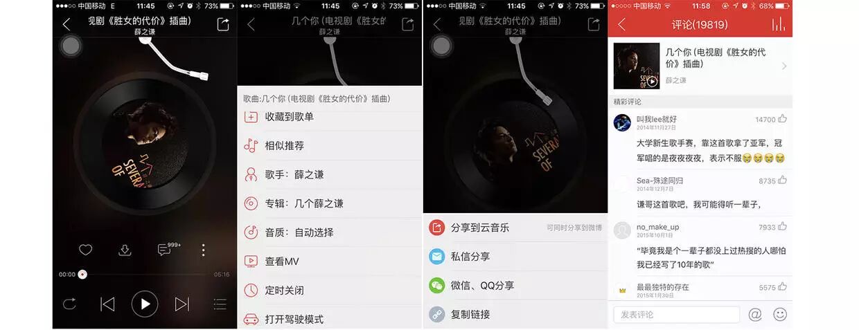 在追求满足用户的娱乐等需求上,云音乐立足于“分享社交”与“活动互动”。在“音乐好友”、“查看好友主页/动态”、“歌词海报制作以及分享”等功能上,用户的选择性相对另两者更灵活,也更突出“社交性”。,“听歌看评论“已经成为云音乐用户的一大标签。用户在社区内发布评论有相当快速而活跃的可能性获得“赞”与“评论”极大促进了社区活跃度。少数歌手如薛之谦甚至参与评论,在演唱会推广期给粉丝发私信,较好的满足了用户的娱乐化需求。线上线下活动互动如校园音乐节等不仅促进了用户的线下社交,也提高了云音乐本身的曝光率。