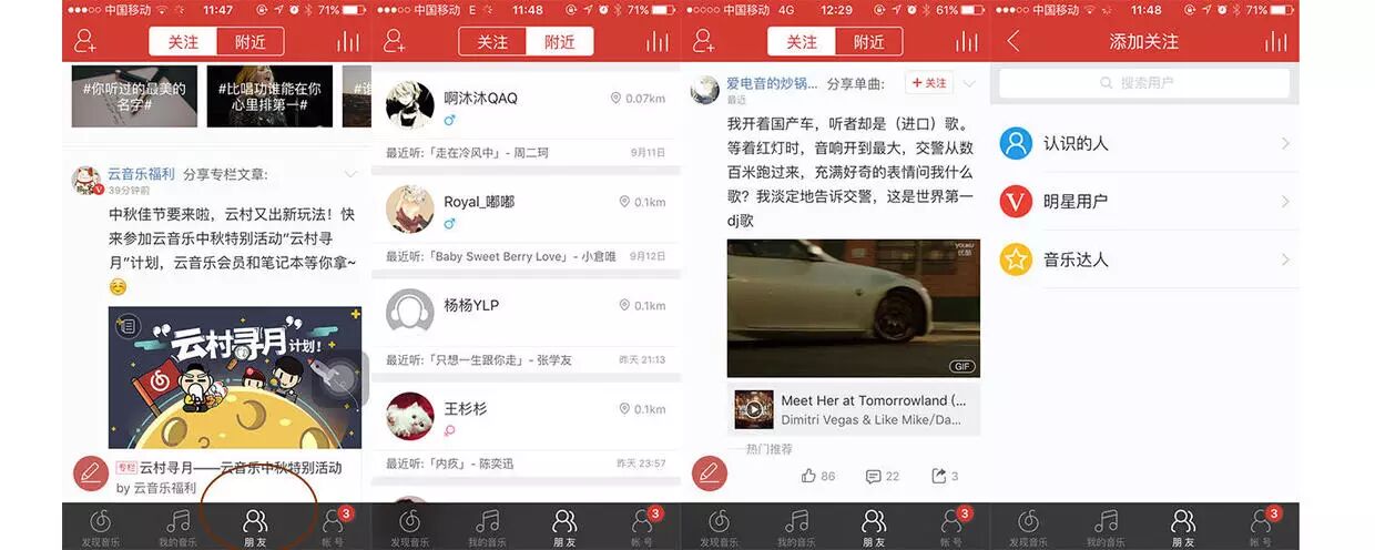 云音乐的突出特点在于将社区作为一个独立的主模块“朋友”,突出“音乐社交”概念,满足用户的社交需求处于产品设计的主要优先级。用户可以关注“认识的人”、“明星用户”以及“音乐达人”,还可以找附近听音乐的朋友。在“朋友”页面,用户可以发送音乐、专辑、图片、短评、专栏文章等内容,并通过点赞、评论与转发进行互动。“朋友”区更新与互动较为活跃,用户间可使用私信功能。此设计有利于突出云音乐的差异化定位,通过活跃的社区互动增加社区粘性。