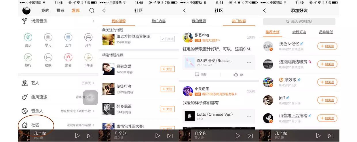 虾米音乐和QQ音乐分别提供了“社区”与“音乐圈”,均作为子模块,满足用户的社交需求处于产品设计的次优先级。