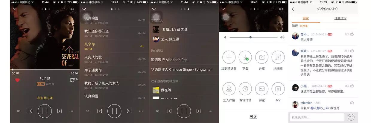 - 播放界面底部菜单栏过长过于拥挤,可以考虑参考虾米音乐和QQ音乐的三界面切换方式,在用户听歌而不切歌的同时,满足用户了解歌手与歌曲相关信息的需求,开发更多互动与场景。如果现在的设计是为了用户切歌方便角度考虑,那么可能有些多余,因为许多耳机已经自带切歌快捷键。