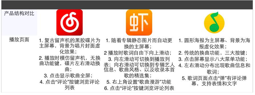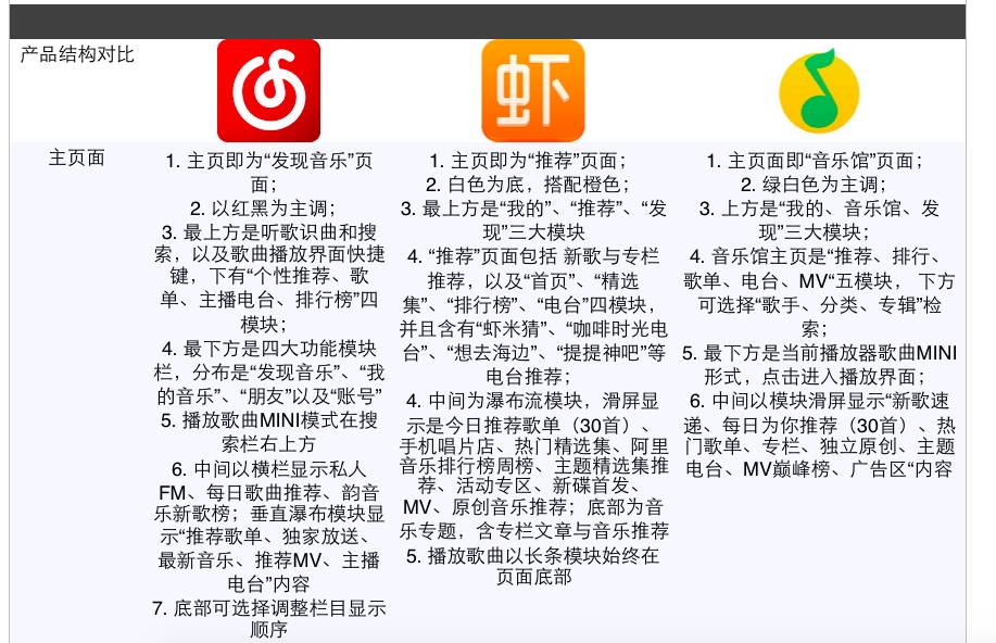 1. 围绕“听歌、搜歌、荐歌、互动”精简功能,可以从K歌、车载场景、在线直播等角度深挖探索。