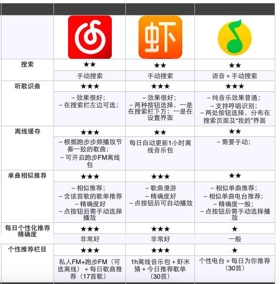 由整体来看,云音乐在保证满足用户核心需求的同时更加专注满足用户社交与娱乐需求,以用户为中心,三大核心功能是私人歌单、歌曲评论、歌曲推荐,高品质音乐无限下载,注重音乐的分享与发现,通过跑步FM与其他多元场景等特色功能实现了较好的差异化和场景延伸,互动活动丰富,会员管理有较好的权利区分度。