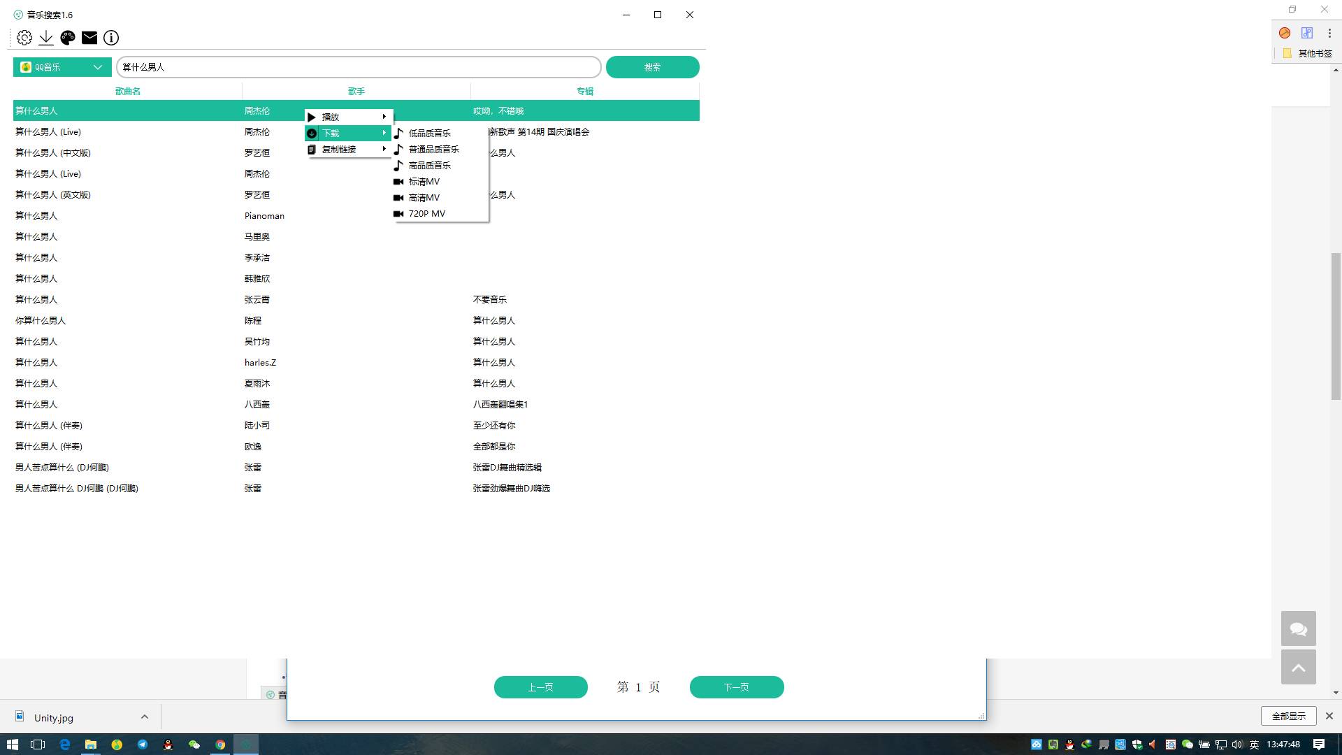 ·在搜索到的音乐上面右键,可以看到有播放、下载、复制链接三个选项。支持音乐,mv各三种品质