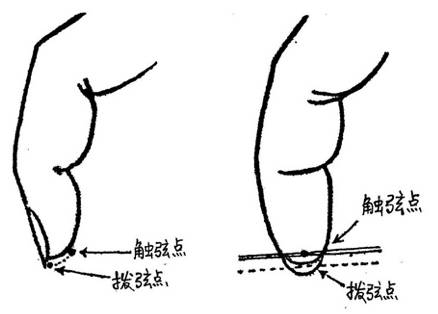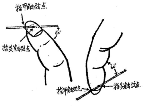 图2.右手与琴弦正面接触,指甲与琴弦正面接触
