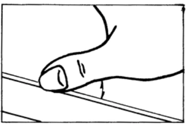 右手食指(I)、中指(M)、无名指(A)要“斜”、“侧”拨弦。所谓的“斜”,就是指右手I、M、A三指与琴弦要形成45—60度的角度,使手指触弦时做到指肉(尖)与指甲同时触弦(两个触弦点)指甲拨弦(一个拨弦点也就是指甲的触弦点),这样就避免了琴弦从指肉(指头、指尖)到指甲之间滑动时所产生的“咔叽咔叽”声,这样发出的音色圆润、透明,杂音也降到最低。注意右手指与琴弦的角度不能太斜,若太斜发出的琴音颗粒就粗,声音也不清晰,右手与琴弦最佳的斜(角)度是45—60度(图1)