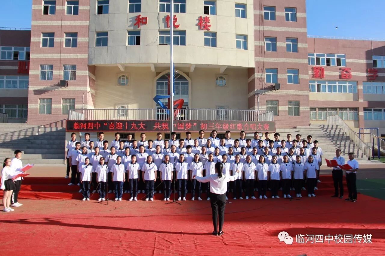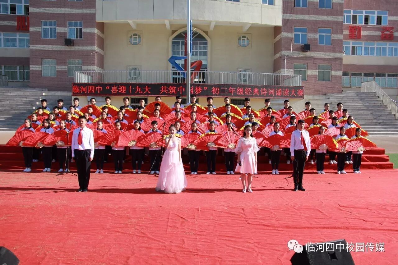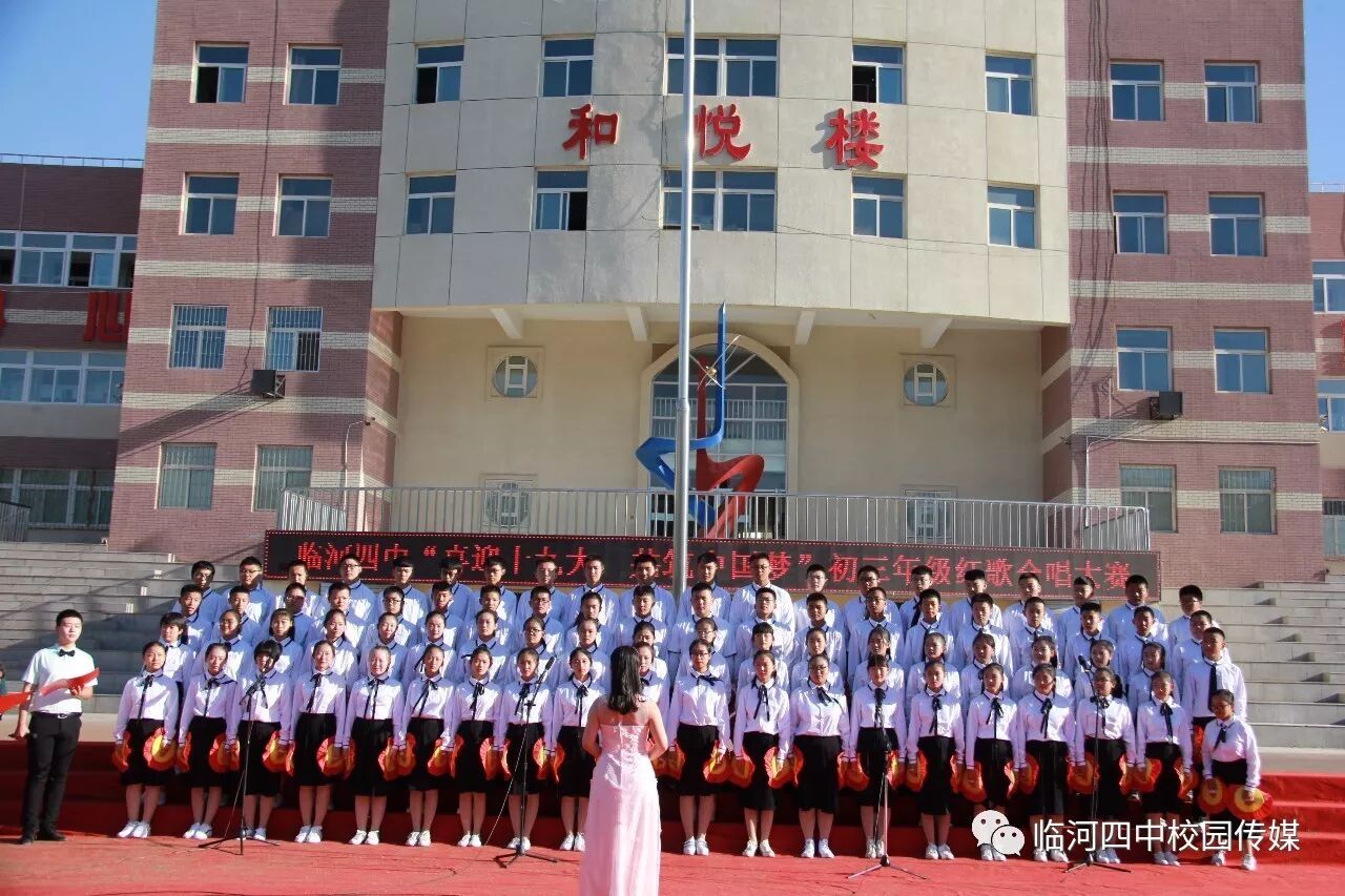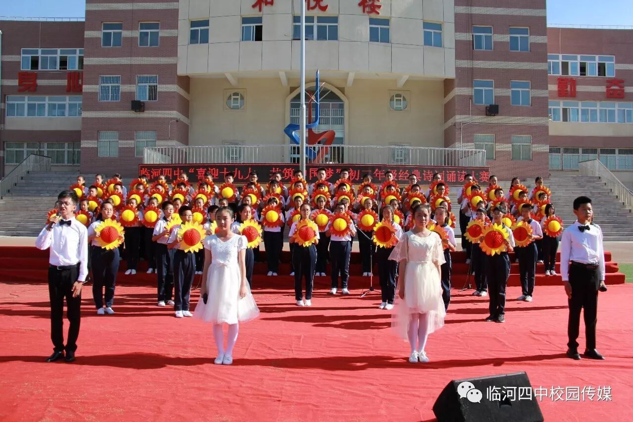 2017年9月27日,临河四中最为盛大的第六届和雅文化艺体节——经典诗文诵读和红歌大合唱竞赛热烈开幕。两项大型活动班班参与、人人参与、师生参与。师生们或吟诵经典或引吭高歌,声情并茂,意气风发,铿锵有力,游响停云。沉淀文化底蕴,陶冶高雅情操;继承红色文化,畅想美好未来。在团委的认真组织下,各班主任精心设计,辛苦排练,用尽心思让展演出彩出新,活动过程丰富了课余生活,增进了师生情感,凝聚力班级力量,收获了育人效果。一场校园文化的盛宴,一组优雅动听的育人乐章。