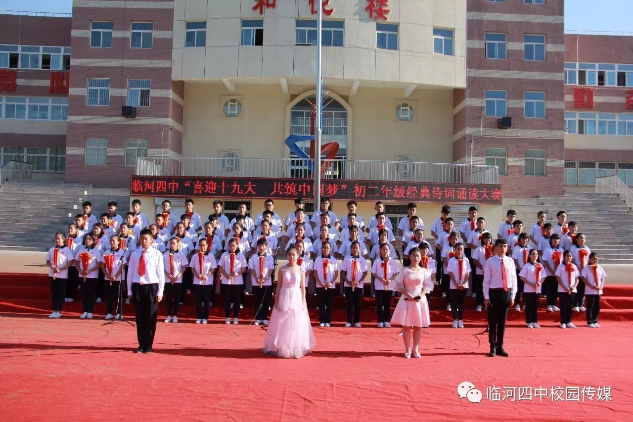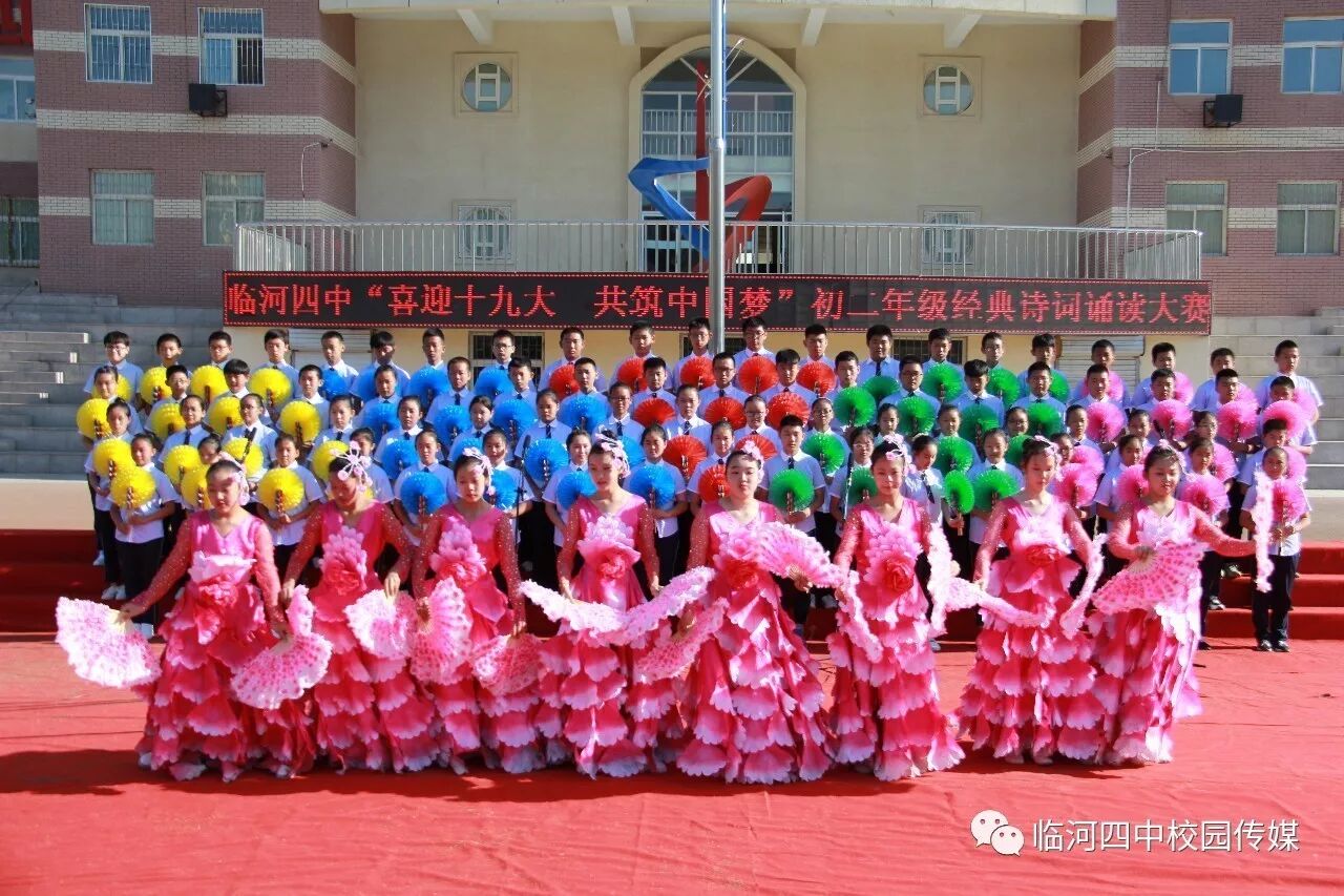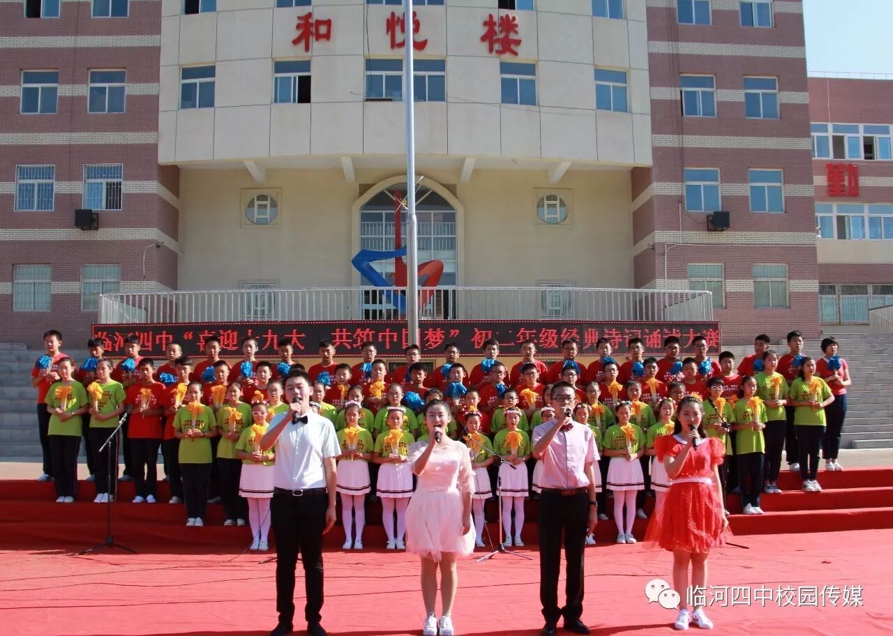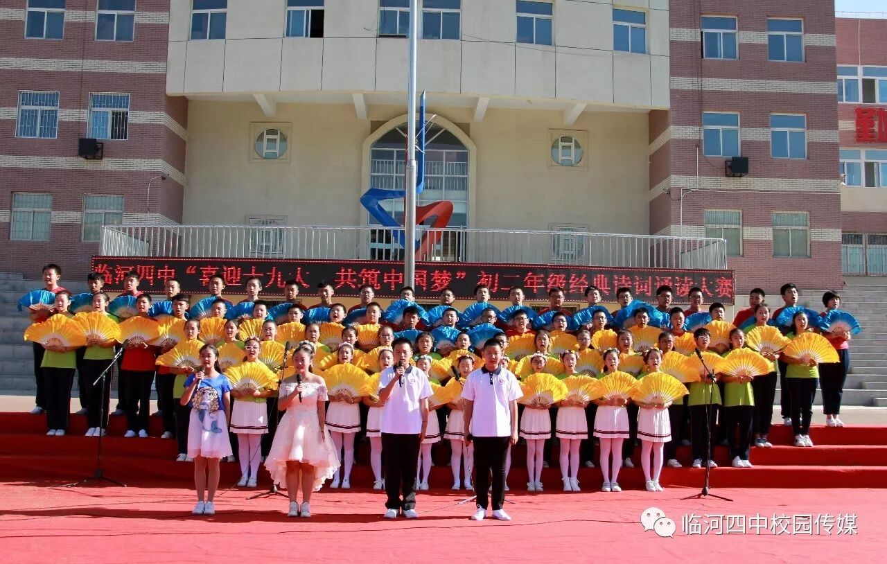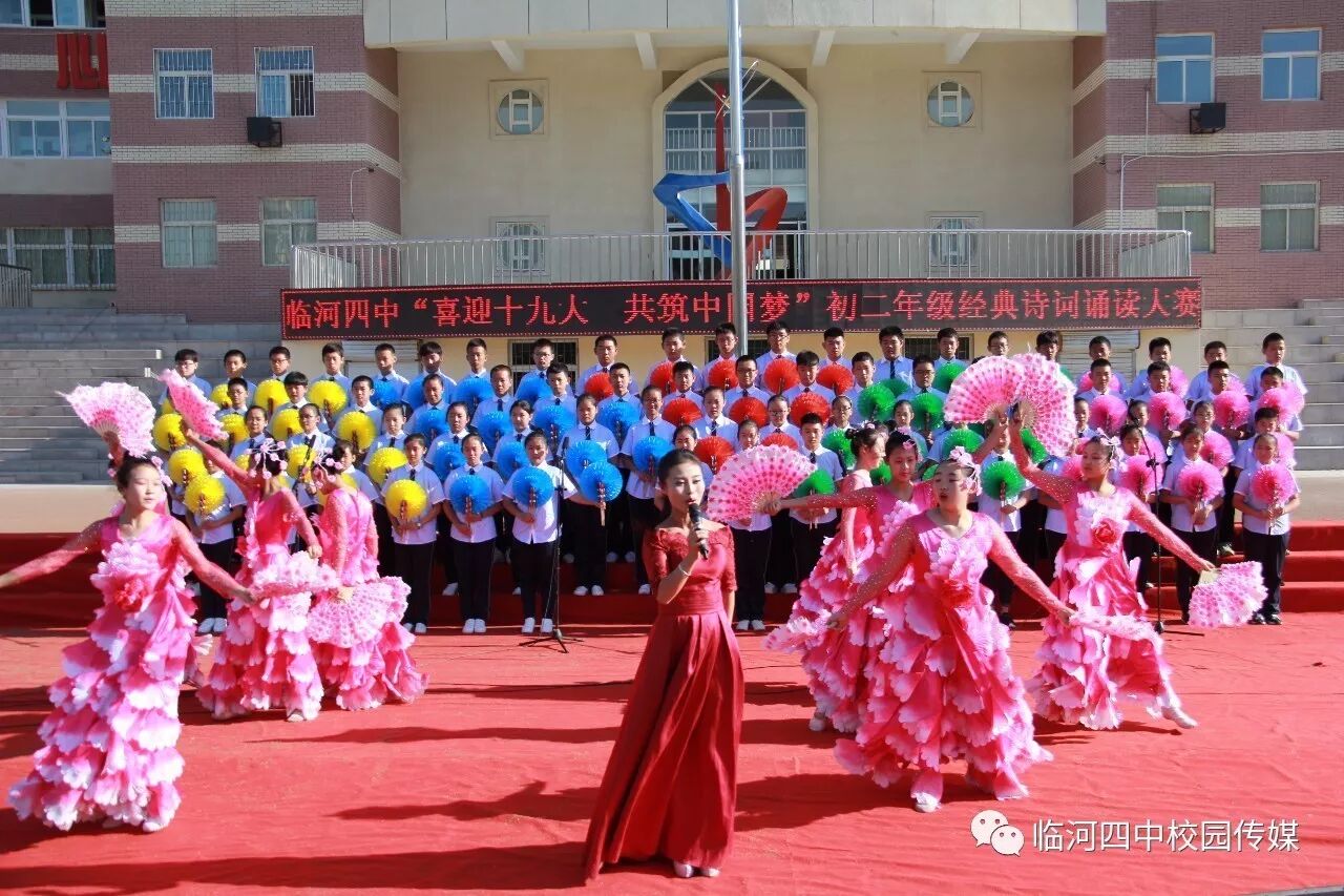 2017年9月27日,临河四中最为盛大的第六届和雅文化艺体节——经典诗文诵读和红歌大合唱竞赛热烈开幕。两项大型活动班班参与、人人参与、师生参与。师生们或吟诵经典或引吭高歌,声情并茂,意气风发,铿锵有力,游响停云。沉淀文化底蕴,陶冶高雅情操;继承红色文化,畅想美好未来。在团委的认真组织下,各班主任精心设计,辛苦排练,用尽心思让展演出彩出新,活动过程丰富了课余生活,增进了师生情感,凝聚力班级力量,收获了育人效果。一场校园文化的盛宴,一组优雅动听的育人乐章。