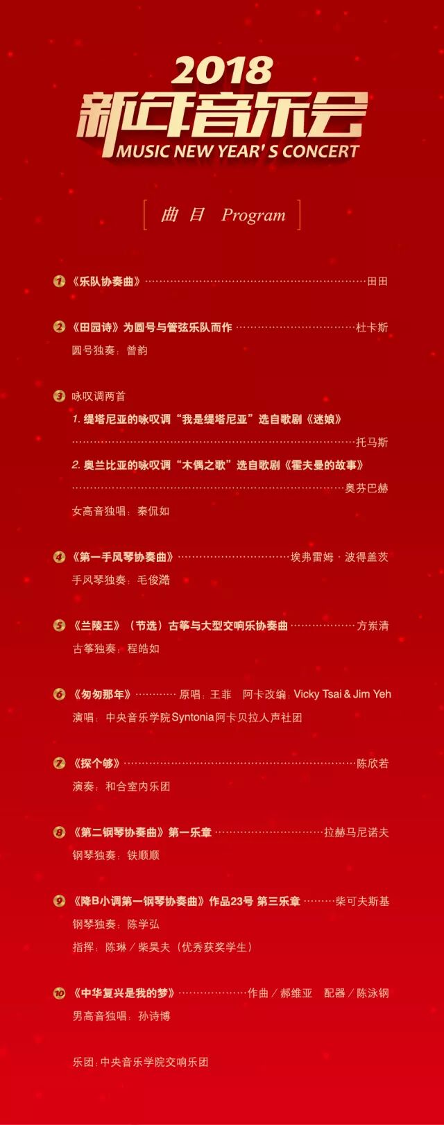 2017年12月25日19:30在中央音乐学院歌剧音乐厅举办中央音乐学院2018新年音乐会,由著名指挥家陈琳教授执棒中央音乐学院交响乐团,携近两年国内外重要奖项获奖者为大家倾心演出。曲目涵盖钢琴、声乐、管乐、民乐等作品。
