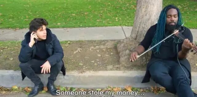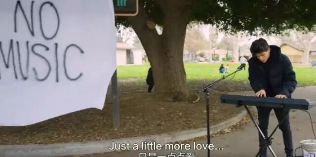 “No Music”显然在女孩子高亢的歌声下出现的并不合适宜,因为这里充满了美妙的声音,歌声,琴声…意想不到的是,小伙的钱就在光天化日之下被抢。