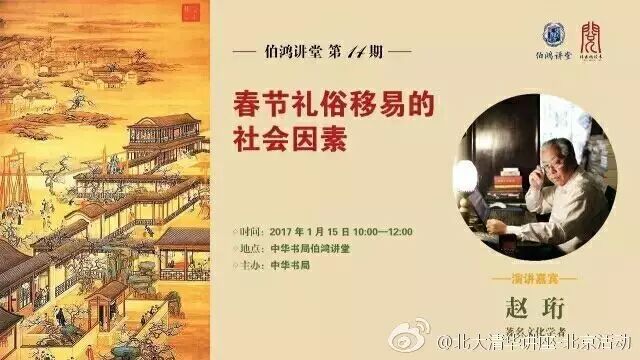 【春节礼俗移易的社会因素】2017年1月15日(周日)10:00-12:00【嘉宾】赵珩(原北京燕山出版社总编辑、编审。现为北京市文物局专家、学术委员。北京史研究会常务理事。国家图书馆文津讲坛特聘教授)【地点】中华书局二楼伯鸿讲堂【预约】http://t.cn/RMXb4OL