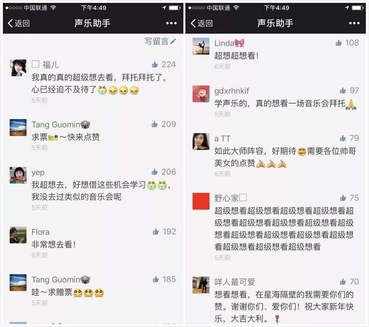 声乐助手作为本场音乐会独家合作行业媒体,为朋友们准备了10张免费赠票,以下为参与留言点赞活动获得赠票的10位小伙伴,恭喜你们!请联系声乐助手客服微信:yinyuejia135,快快来领取你的赠票吧!