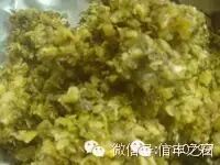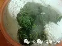 6把煮烂的艾草捞起控干水倒入糯粉和面粉里。用搅匀,然后揉成面团。