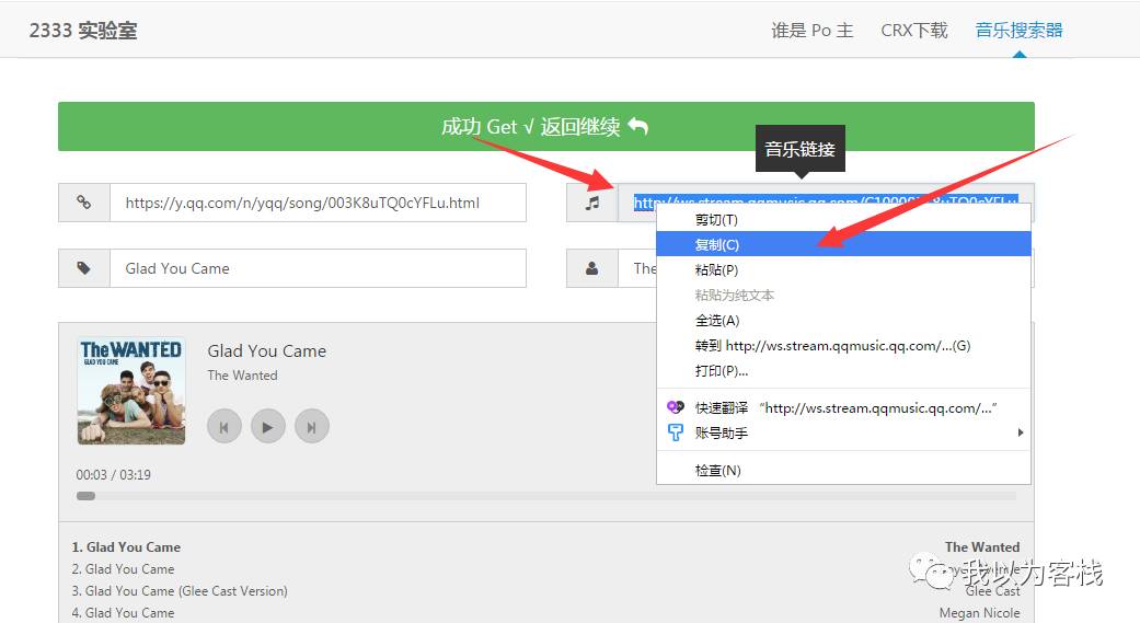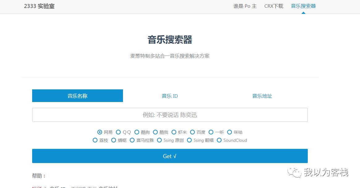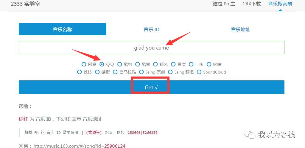 这时候我们就需要用到我们的“2333实验室”这个网站了,因为网易里面提示需要付费,我们在下面搜索栏里面选择QQ,然后输入歌名,点击get