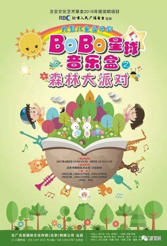 2016年北京市文化艺术基金资助项目、北京电台监制的《bobo星球音乐盒之森林大派对》大型音乐儿童剧,4月8日和9日在朝阳文化馆上演啦!