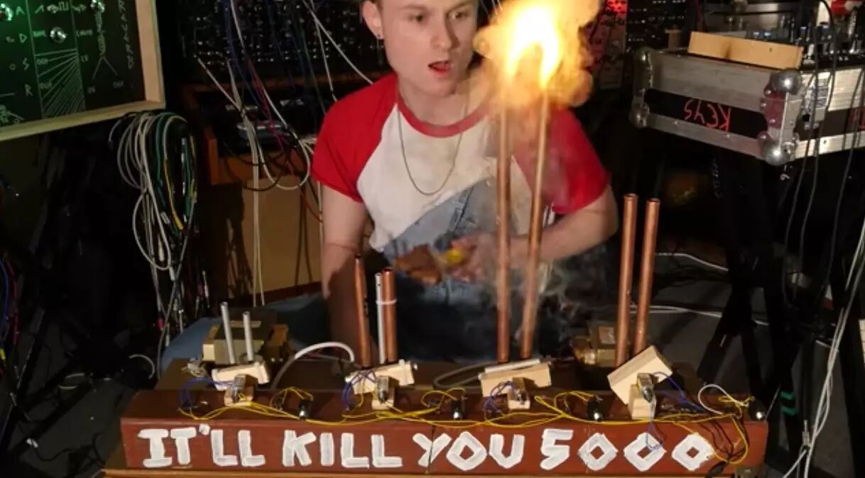 这次Sam又搞了个神器——It'll Kill You 5000(如有神翻译去评论区上墙)一台连接鼓机(鼓机是模拟鼓声电子合成器的简称)的节奏电弧火花放电器,感觉像是未来世界那种地下Club里演奏音乐用的“外设”,相当酷炫,相当费电,相当牛X!