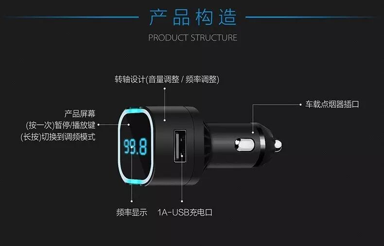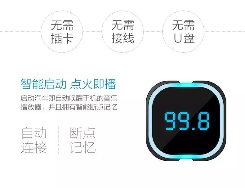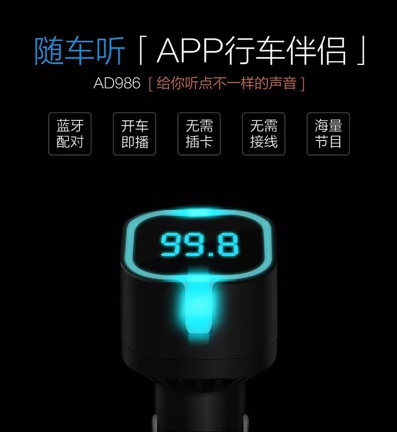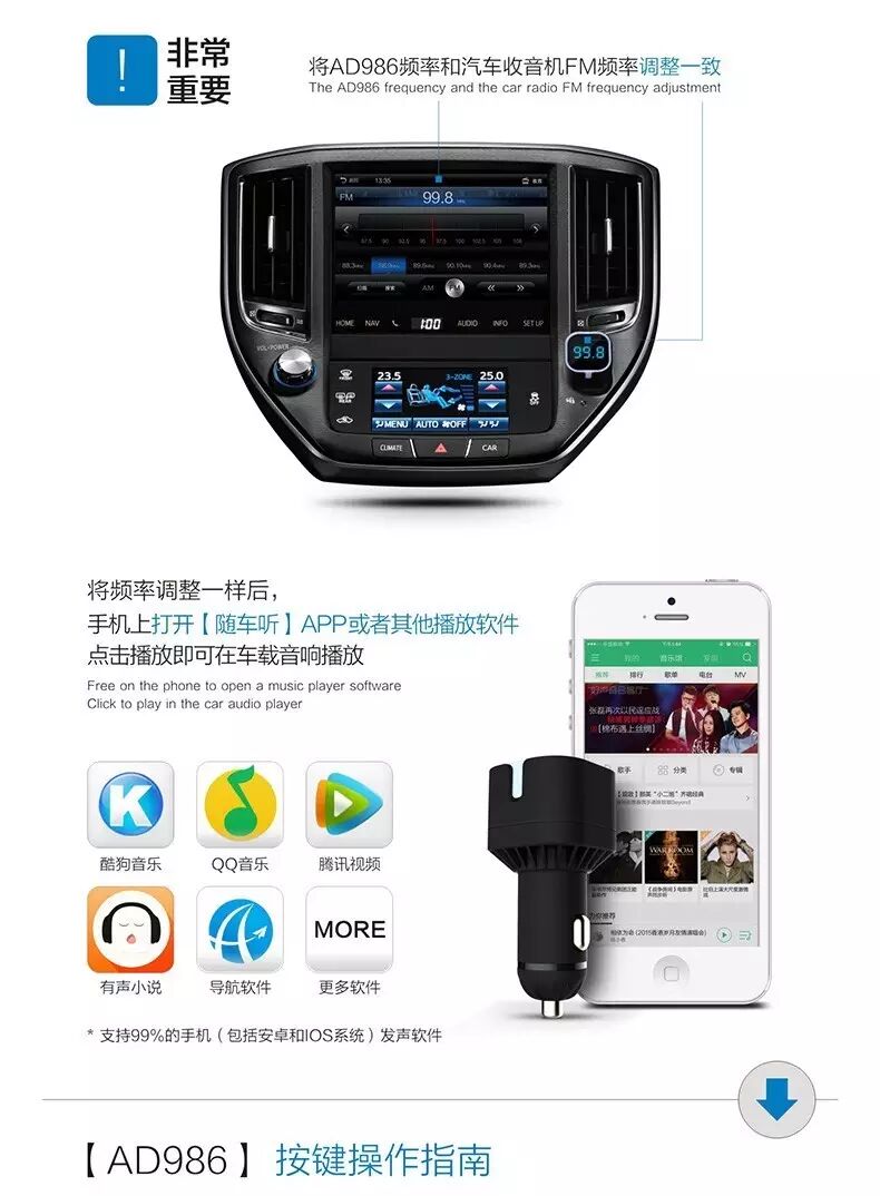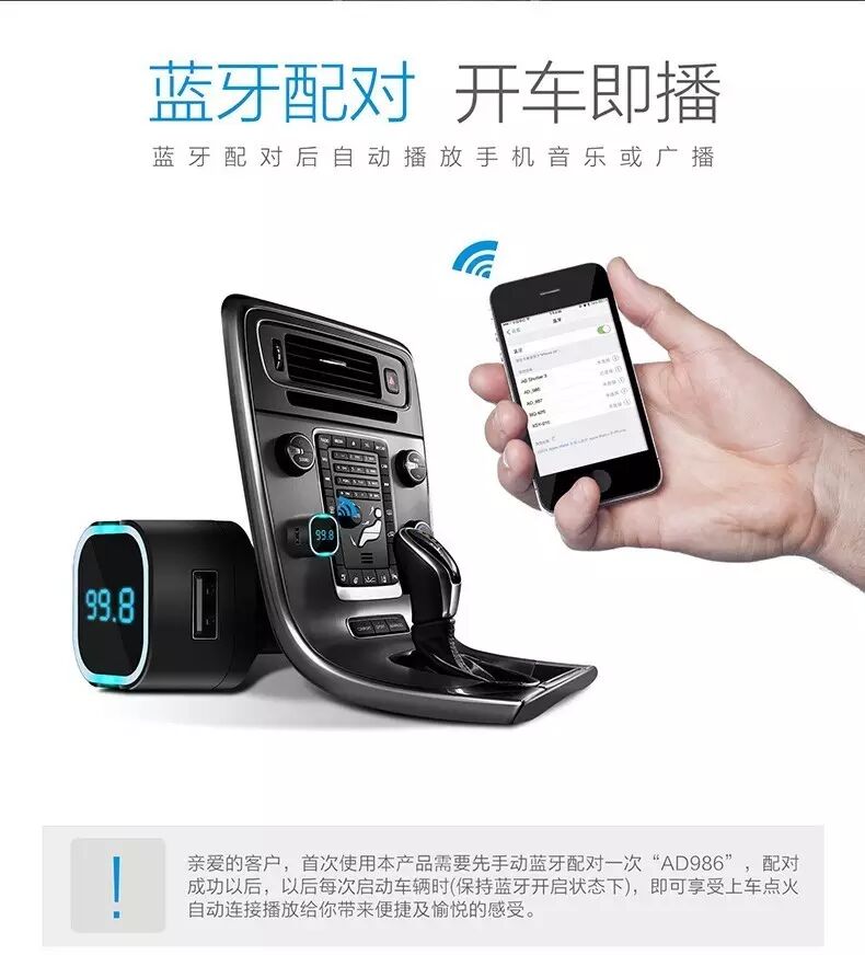 蓝牙配对,开车即播。将AD986频率和汽车收音机FM频率调整一致,手机上打开【随车听】APP或者将其他播放软件点击播放即可在车载音响上播放。当然它无需插卡、无需接线、无需U盘,智能启动,点火即播。