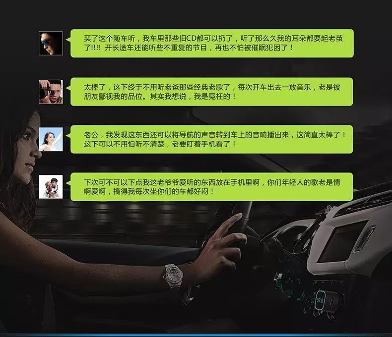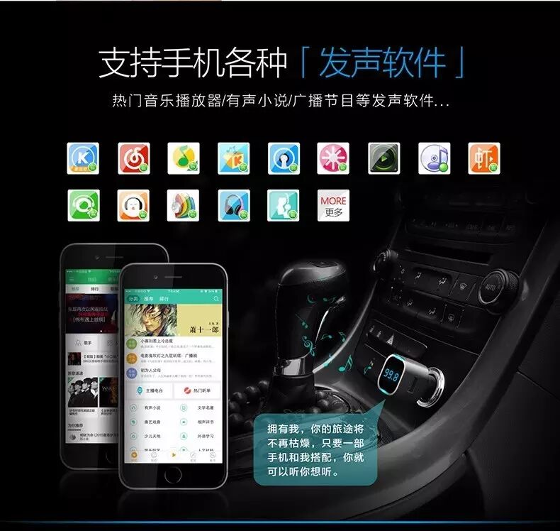 智能车载新概念,旗舰店首发,新品促销!无线车载播放器,多种无损音乐格式+大功率+车载FM发射器,蓝牙互联,手机APP操作(支持安卓及苹果系统),FM发射,可完成手机视频、音乐、语音通话导航等音频连接到车载音响中。
