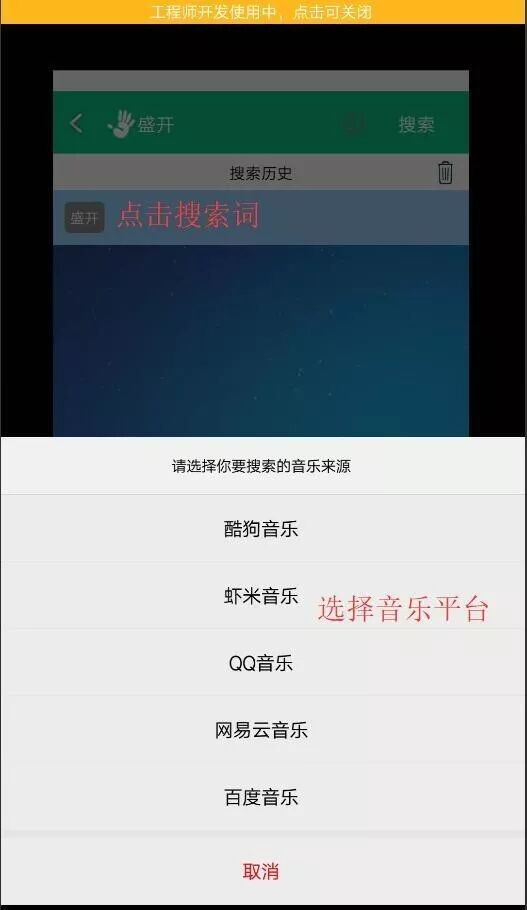 选择要搜索的音乐来源,音乐狂提供了酷狗音乐、虾米音乐、QQ音乐、网易云音乐、百度音乐五个音乐来源。