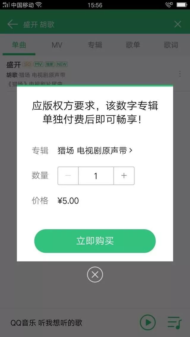 但是,如果要下载或试听,需要支付5元费用才可以,如下图QQ音乐上的付费截图所示。