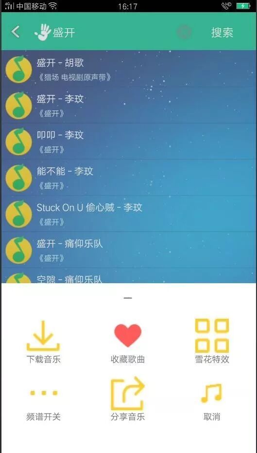 下载页面提供了六个选项:下载音乐、收藏歌曲、雪花特效、频谱开关、分享音乐、取消。具体使用方法,可以自个摸索一下。