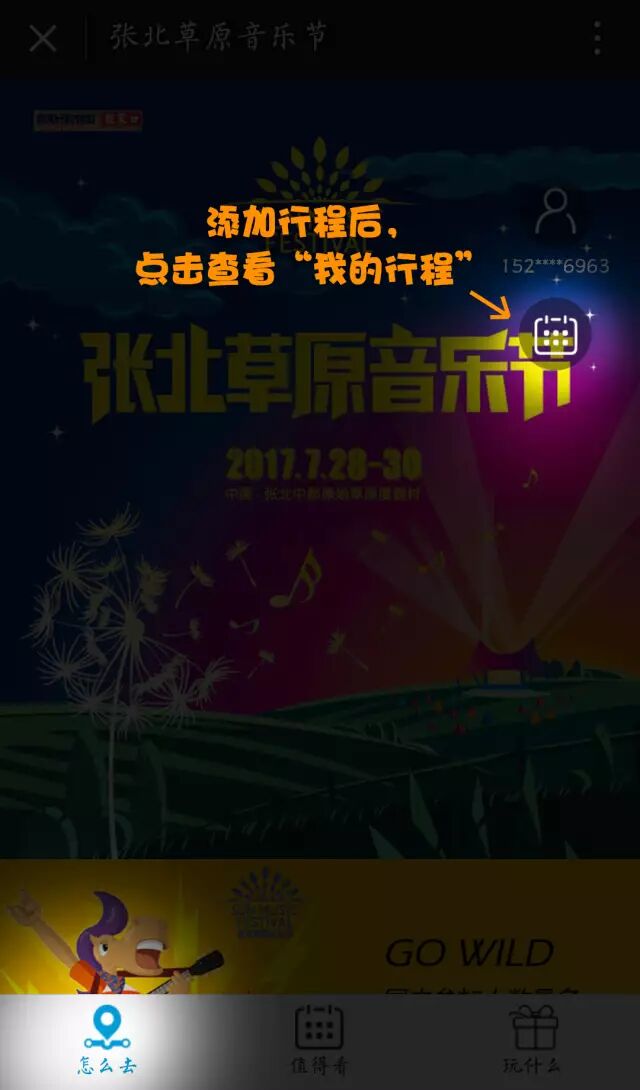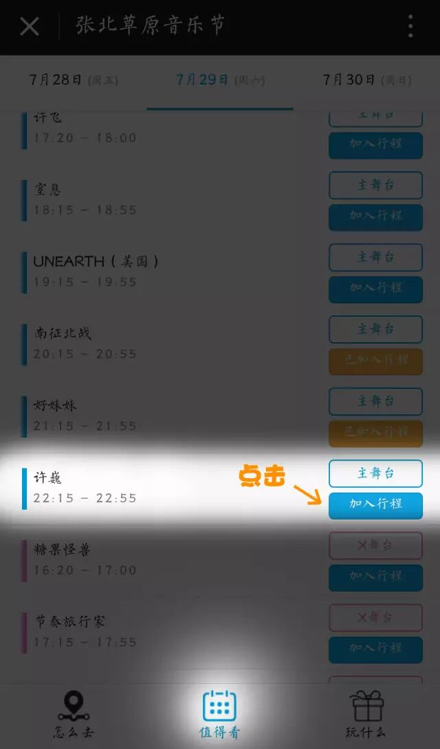 打开SUNMUSIC小程序,选择【值得看】栏目即可查看张北草原音乐节活动期间的演出安排,找到你想看的演出,点击“加入行程”。