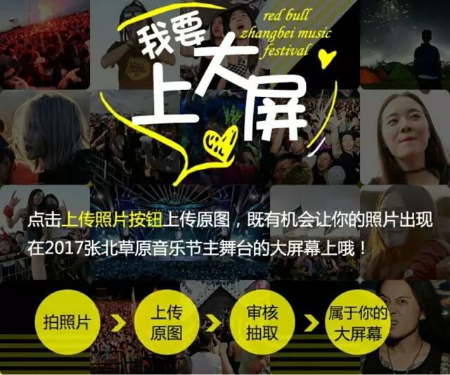 在此页面点击上传照片按钮,即可上传你在音乐节现场拍摄的照片,不限拍摄手法,不限拍摄器材,无论是自拍、合影还是现场照通通有机会登上现场大屏幕,与数万现场观众分享!