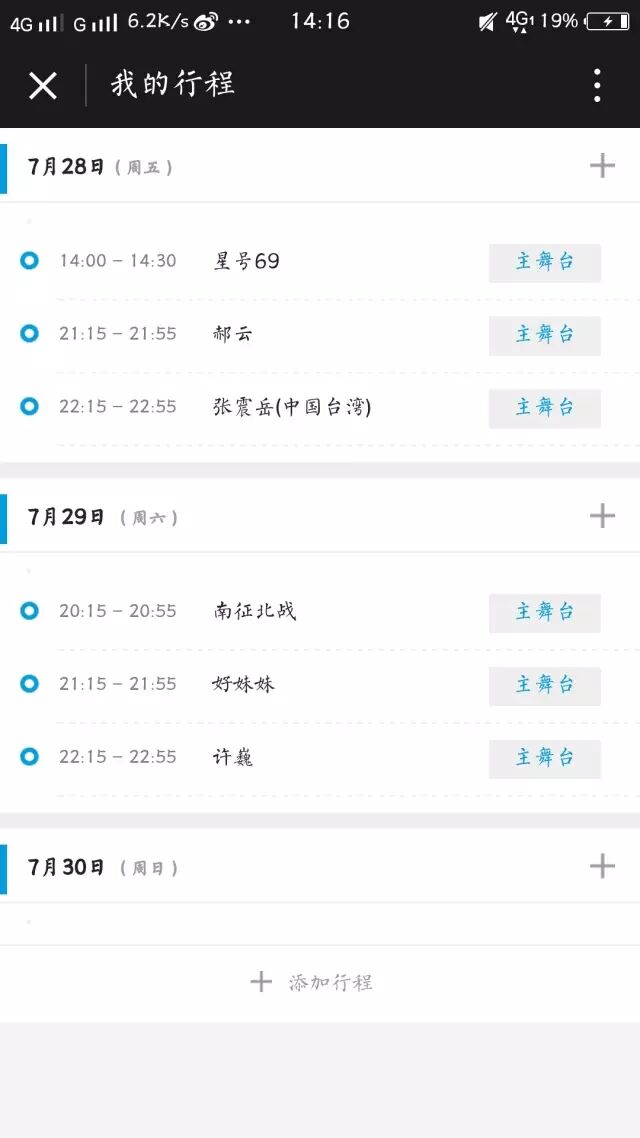 添加行程后返回SUNMUSIC首页,点击右上方“我的行程”即可查看个性定制行程时间表。