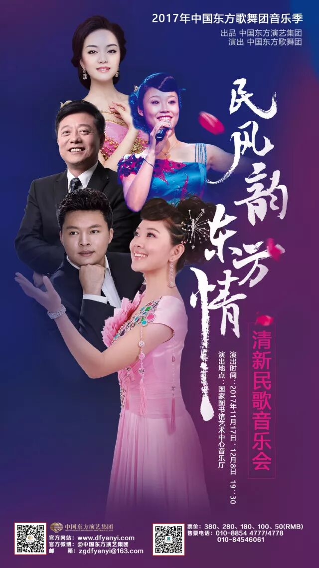 《民风韵•东方情》清新民歌音乐会是集山西、陕西、山东、江苏、湖北、广西、贵州、四川、新疆、内蒙、青海、吉林、云南等十三个省区经典民歌为一场的民歌专场音乐会,是中国传统民歌的一个汇总与展示。中国民歌是我国民族民间音乐体裁的一种,是人民群众在生活实践中经过广泛的口头传唱,而产生和发展起来的歌曲艺术。此次音乐会曲目均为广大观众所熟知并喜爱,同时音乐会将传统、西洋、流行等风格完美的结合在一起,在不失传统韵味的同时融合东方特有的艺术表现形式,将这一首首久唱不衰、百听不厌、家喻户晓、脍炙人口的作品,通过民歌的继承与发展、以及传统民歌的唱法与现代发声方法相结合的艺术理念,用源于传统又高于传统的表现手法及舞台表演形式,让观众在熟悉的旋律中耳目一新。
