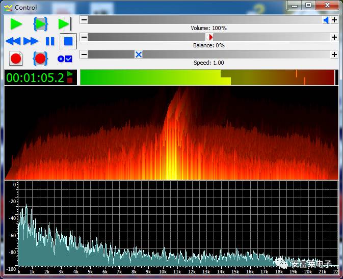 (2)网上还有一种说法是人的听觉响应与强度成对数关系。现在我已经将MP3软件播放器频谱显示设置为了两种显示方案,幅值谱和对数谱,千千静听是采用这种对数谱。