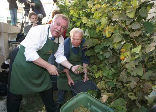 ▼维也纳现任市长Michael Häupl在采葡萄。自1988年以来的10月初维也纳市长会亲自来这里采收葡萄。这个已经成为传统的活动叫“市长采收”。