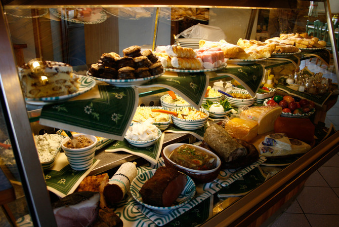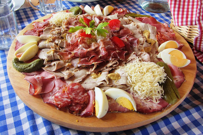 ▼在奥地利酒馆里的凉拼盘,通常内容为火腿,香肠,熏肉,酱料,芥末,辣根,腌菜,腊肠,煮鸡蛋,不同种类的奶酪和面包。传统方式是将所有的食物摆放在一个木质托盘上。