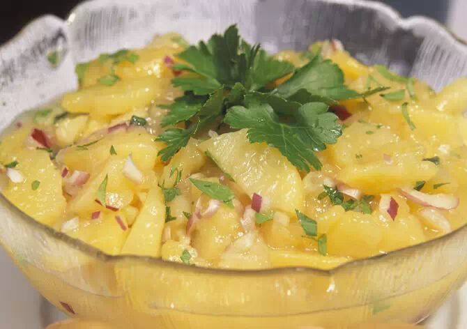 ▼维也纳土豆沙拉。奥地利餐桌上,土豆以主食或配菜出现的形式非常多见。家喻户晓的应该就是这道既简单又好吃的维也纳土豆沙拉了。