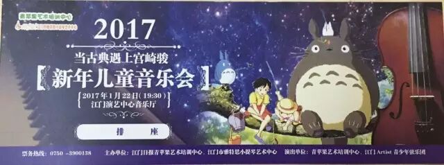 2017年江门新年儿童音乐会——《当古典遇上宫崎骏》将于1月22日晚在江门演艺中心举行。一次零距离接触大师音乐的机会,一场不容错过的经典音乐盛典,一种直观感受美妙音乐艺术带来的享受,怎能错过!