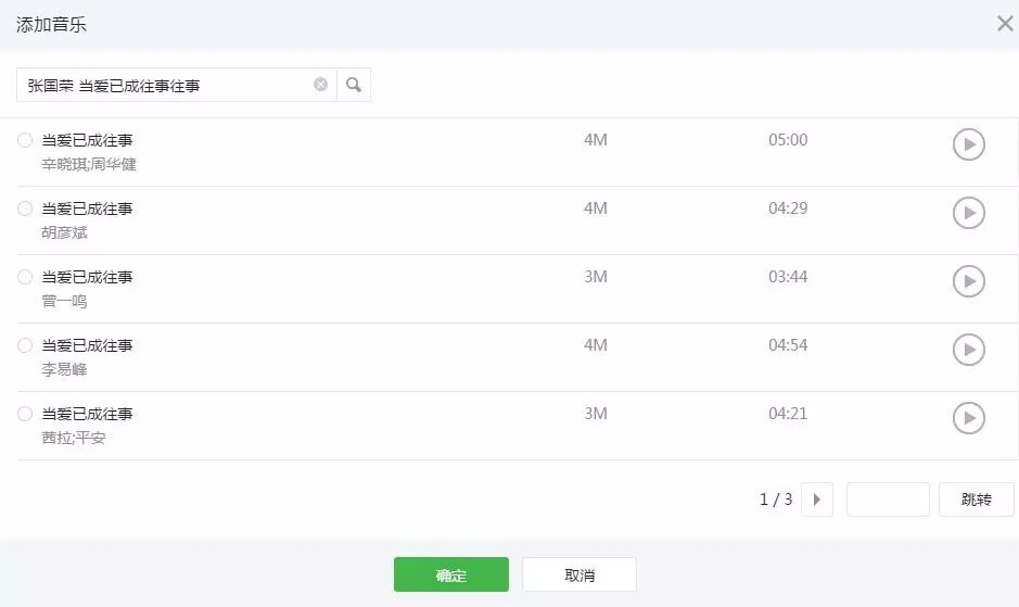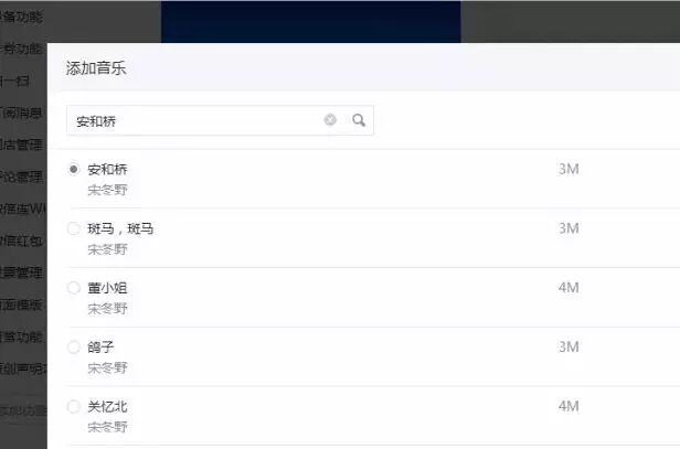 2. 选取音乐时,支持根据歌名、作者进行搜索,并且可以试听音乐。